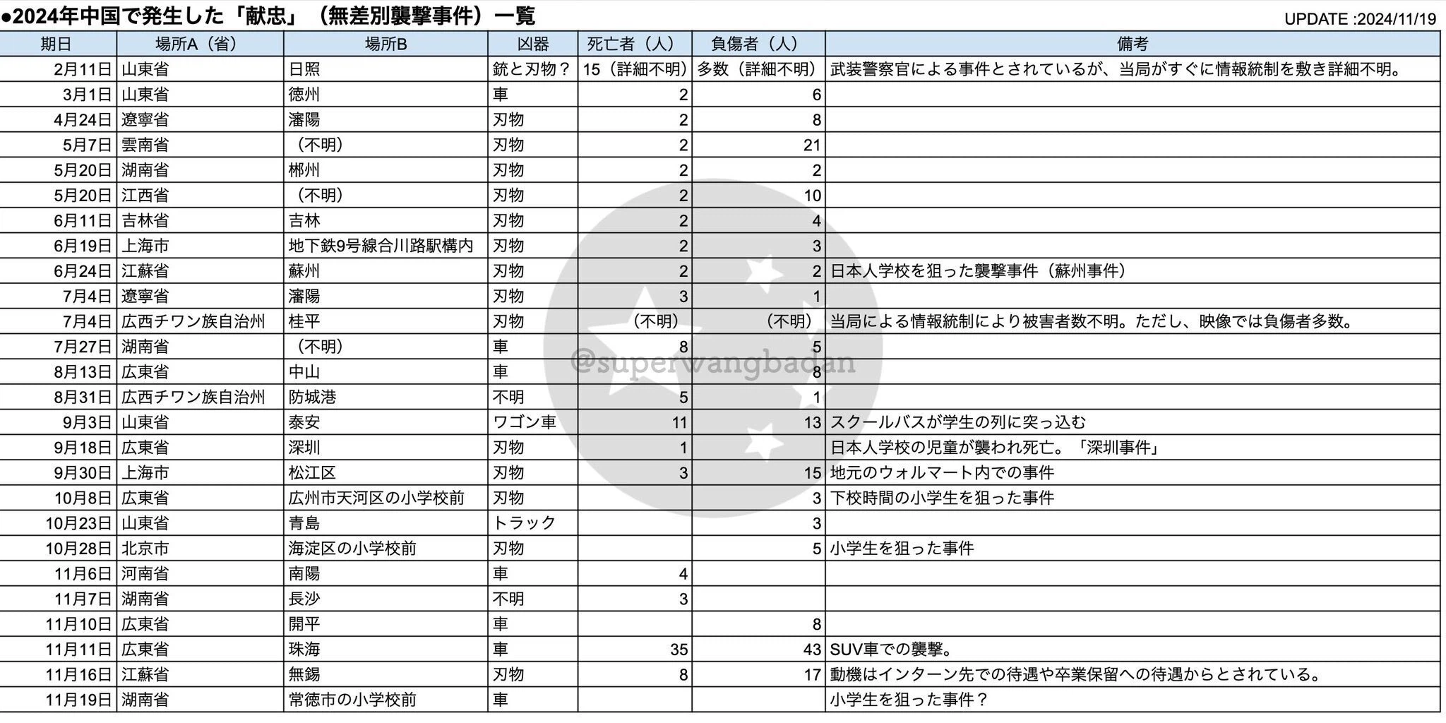 上の表は、筆者が中国SNSやXの信頼できるアカウントから把握した、2024年1〜11月の「献忠」のリストです。